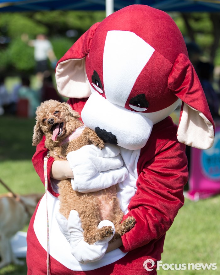 (서울=포커스뉴스) 12일 오후 서울 광진구 건국대학교 잔디광장에서 수의과대학 주최로 열린 '반려견과 함께하는 축제, 반함'에서 강아지 탈을 쓴 행사 관계자가 반려견과 기념촬영을 하고 있다.
