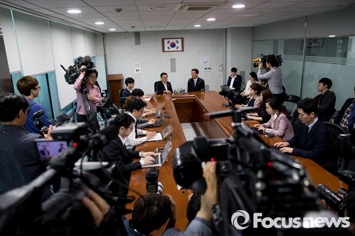 (서울=포커스뉴스) 박근혜 대통령과 3당 원내대표의 회담을 앞두고 현기환(오른쪽) 청와대 정무수석이 12일 오후 서울 여의도 국회의원회관에서 박지원 국민의당 원내대표와 면담에 앞서 악수 하고 있다.