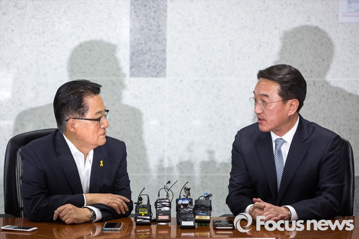 | △ 대화하는 박지원 원내대표-현기환 정부수석 |