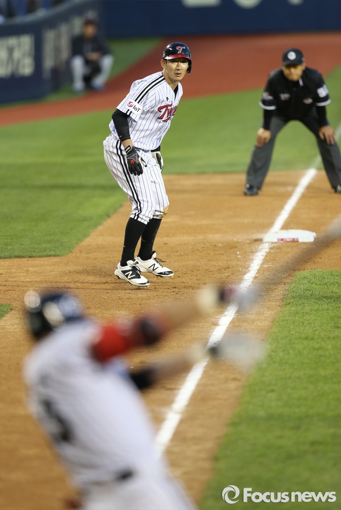 (서울=포커스뉴스) 12일 서울 잠실구장에서 열린 2016 프로야구 삼성-LG 경기 3회말 1사 3루에서 LG 박용택이 우전 적시타를 날리고 있다. 3루주자는 손주인.