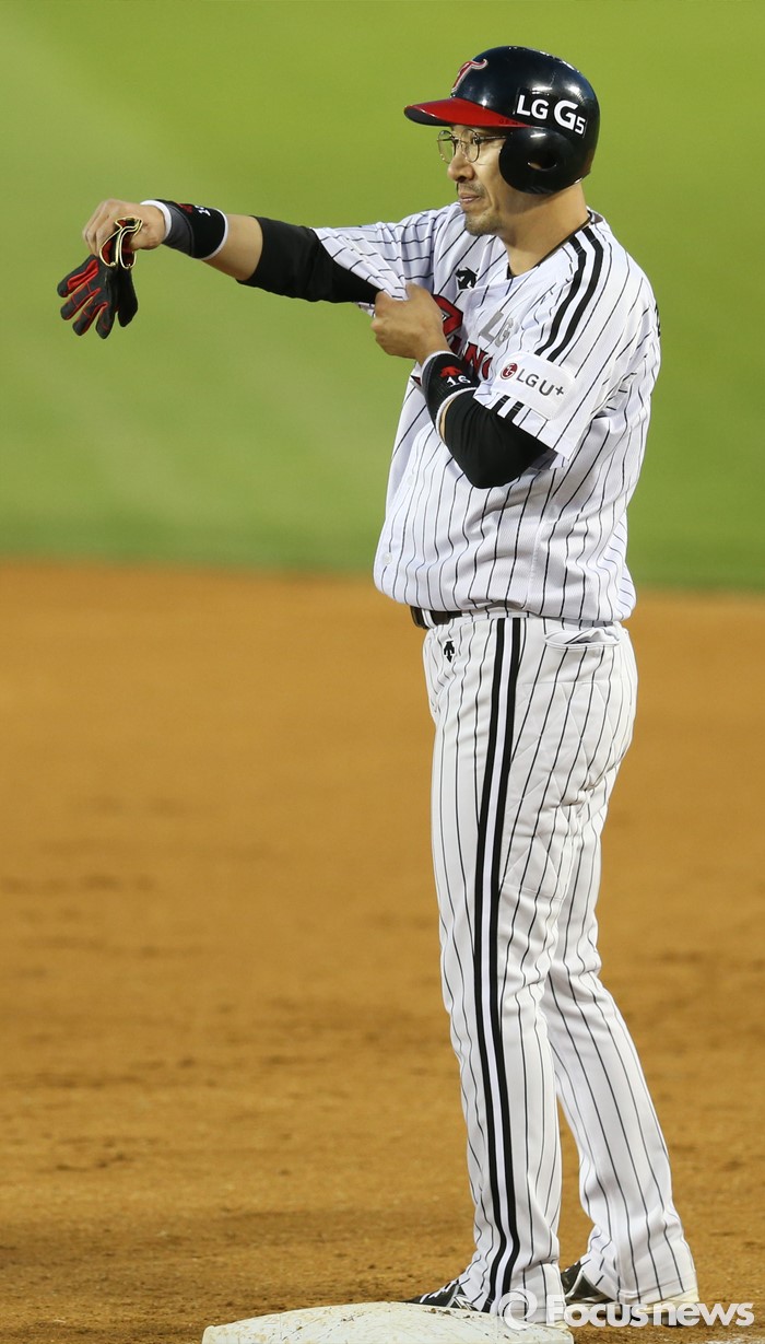(서울=포커스뉴스) 12일 서울 잠실구장에서 열린 2016 프로야구 삼성-LG 경기 3회말 1사 1,2루에서 LG 정성훈이 우전 안타를 치고 1루에 서있다. 정성훈은 프로통산 12번째 2800루타를 기록했다.