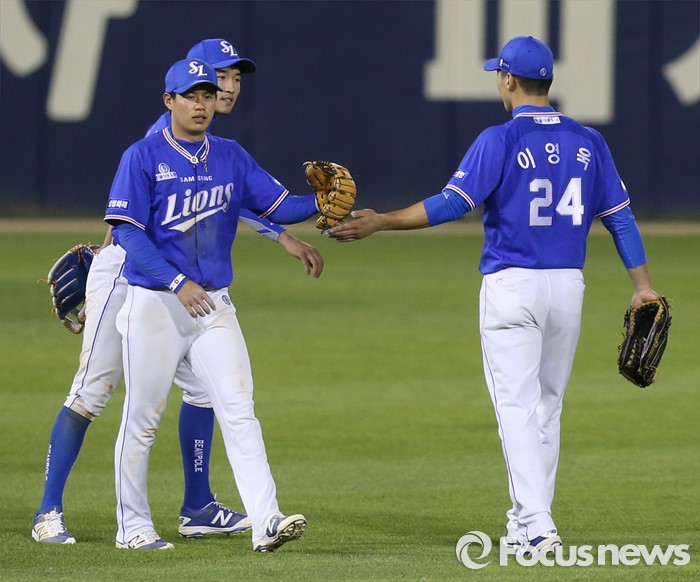 (서울=포커스뉴스) 12일 서울 잠실구장에서 열린 2016 프로야구 삼성-LG 경기에서 9회말 무사 1루에서 LG 박용택의 안타성 타구를 잡아 병살로 연결한 삼성 유격수 김재현이 이영욱과 글러브를 마주치고 있다.