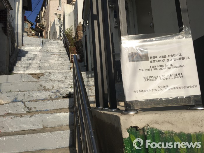 한편 문화체육관광부 관계자는 벽화 복원과 관련해 "빠른 복원보다는 문제의 근본 원인을 해결하는 것이 중요하다고 보고 있다"며 "추후 주민 공청회등을 열어 의견을 수렴해 정책 방향을 잡아나갈 것"이라고 밝혔다.<서울=포커스뉴스> 관광명소로 알려진 서울 종로구 이화동 9-472번지 계단에 그려진 잉어 그림에 회색 유성페인트가 칠해져있다. 김대석 기자