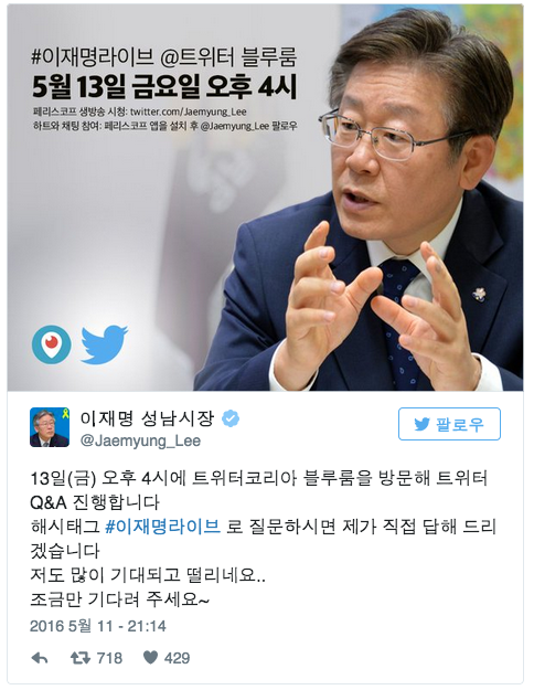 트위터, 이재명 성남시장 라이브 Q&A 진행