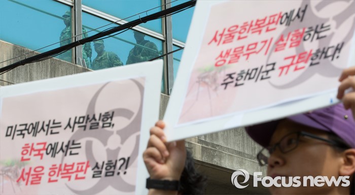 (서울=포커스뉴스) 13일 오전 서울 용산구 미8군 2번 게이트 앞에서 전쟁반대평화실현국민행동을 비롯한 시민단체 회원들이 '서울 한복판 지카바이러스 실험추진, 주한미군 규탄 기자회견'을 하고 있다.