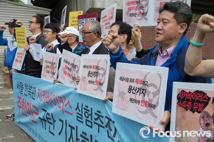 (서울=포커스뉴스) 13일 오전 서울 용산구 미8군 2번 게이트 앞에서 전쟁반대평화실현국민행동을 비롯한 시민단체 회원들이 '서울 한복판 지카바이러스 실험추진, 주한미군 규탄 기자회견'을 하고 있다.