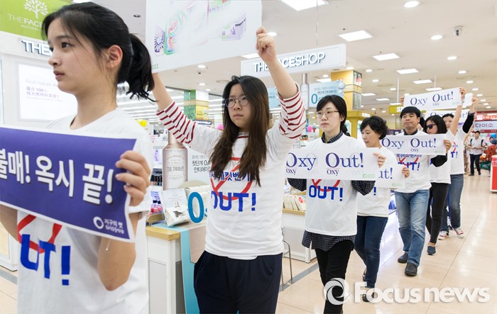 (서울=포커스뉴스) 13일 오전 서울 중구 롯데마트 서울역점에서 환경운동연합과 가습기 살균제 피해자 가족모임이 '옥시 제품 즉각 판매 중단'을 촉구하고 있다.