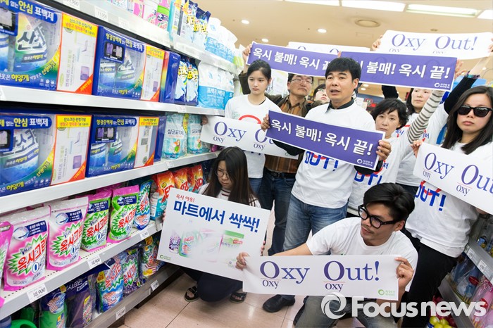 (서울=포커스뉴스) 13일 오전 서울 중구 롯데마트 서울역점에서 환경운동연합과 가습기 살균제 피해자 가족모임이 '옥시 제품 즉각 판매 중단'을 촉구하고 있다.