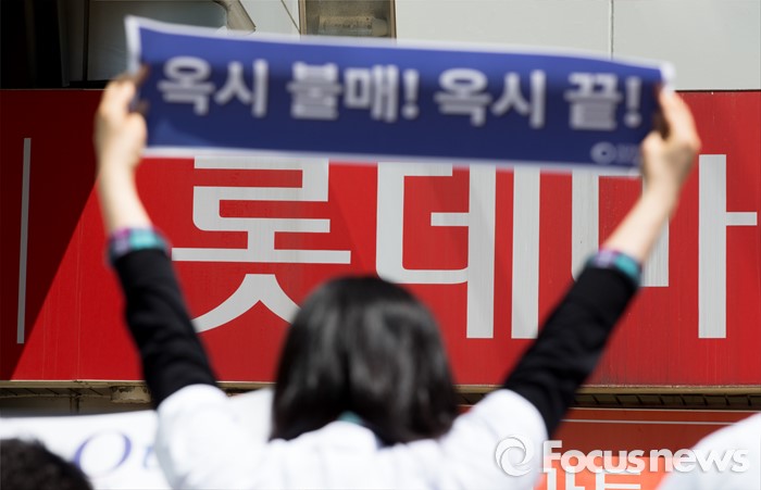 (서울=포커스뉴스) 13일 오전 서울 중구 롯데마트 서울역점 앞에서 환경운동연합과 가습기 살균제 피해자 가족모임이 '옥시 제품 즉각 판매 중단'을 촉구하고 있다.