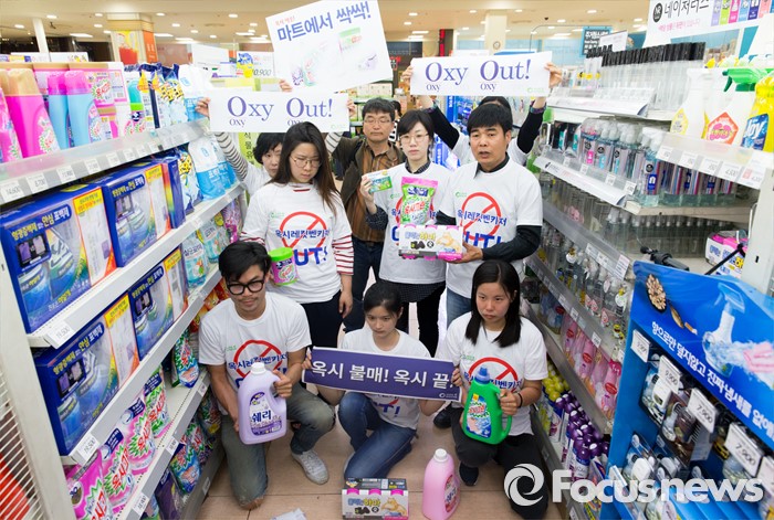 (서울=포커스뉴스) 13일 오전 서울 중구 롯데마트 서울역점에서 환경운동연합과 가습기 살균제 피해자 가족모임이 '옥시 제품 즉각 판매 중단'을 촉구하고 있다.