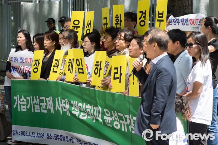(서울=포커스뉴스) 13일 오후 서울 종로구 정부서울청사 후문에서 가습기살균제피해자와가족모임을 비롯한 시민단체 회원들이 '윤성규 환경부 장관 해임 요구 기자회견'을 하고 있다.