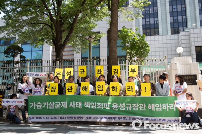 (서울=포커스뉴스) 가습기살균제 피해자와 가족모임(가피모)과 환경보건시민센터 등 환경시민단체들은 13일 오후 서울 종로구 정부종합청사 후문 앞에서 기자회견을 열고 윤성규 환경부 장관의 해임을 촉구했다.