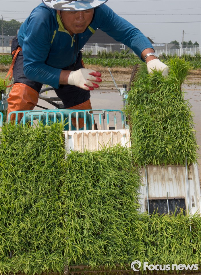 (청주=포커스뉴스) 13일 오후 충북 청주시 서원구의 한 논에서 농민이 이양기를 이용해 모내기를 하고 있다.