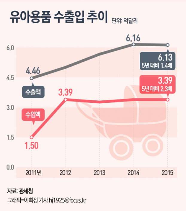 (서울=포커스뉴스) 12일 관세청이 공개한 ‘최근 5년간 유아용품 수출입 동향’에 따르면 지난해 유아용품 수출액은 3억4000만 달러로 2011년과 비교해 2.3배가 증가했다. 수입액은 6억1000만 달러로 2011년 대비 1.4배 늘었다.