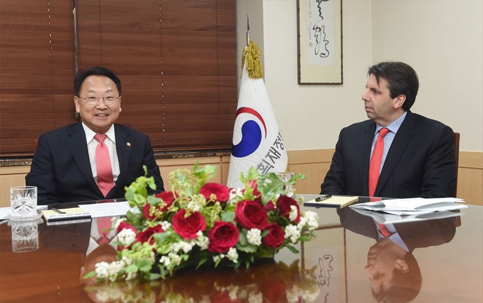 리퍼트 대사는 또 "한국은 미국의 6대 교역국으로 매우 중요한 경제협력 파트너로서, 환태평양경제동반자협정(TPP) 등 한미 상호간 윈윈(win-win)할 수 있도록 쌍방향 기업 투자촉진, 에너지·우주·과학기술 등 새로운 분야로의 경제협력을 확대해 나갈 필요가 있다"고 말했다.(서울=포커스뉴스) 13일 서울 종로구 정부서울청사에서 유일호(왼쪽) 경제부총리 겸 기획재정부 장관이 마크 리퍼트 주한 미국대사와 면담 하고 있다. <사진제공=기획재정부>