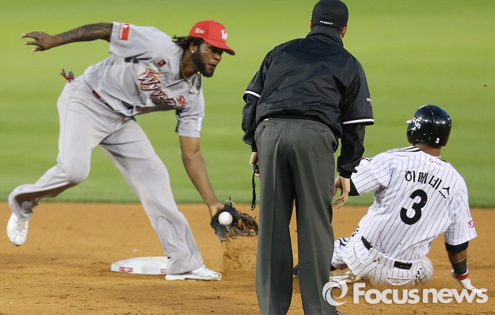 (서울=포커스뉴스) 13일 서울 잠실구장에서 열린 2016 프로야구 SK-LG 경기 4회말 죄전 안타로 진루한 LG 히메네스가 오지환이 삼진 아웃되는 사이에 2루 도루를 시도하다 SK 유격수 고메즈에게 태그아웃되고 있다.