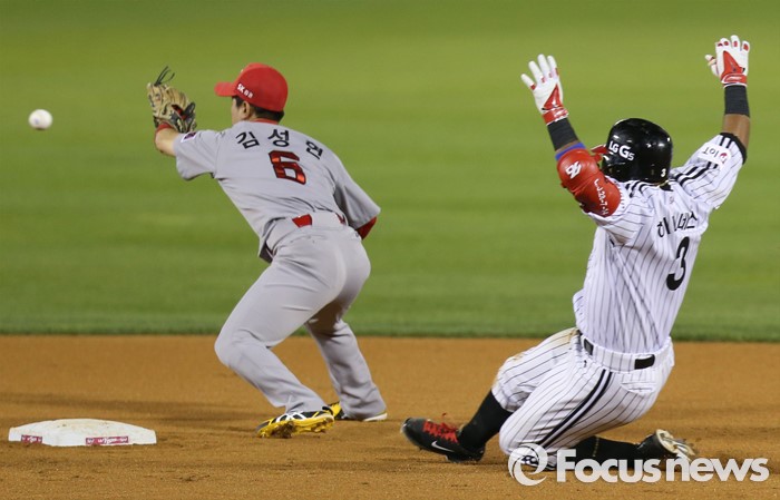 (서울=포커스뉴스) 13일 서울 잠실구장에서 열린 2016 프로야구 SK-LG 경기 6회말 무사 3루에서 LG 히메네스가 좌익선상으로 빠지는 적시 2루타를 치고 2루에서 슬라이딩하고 있다.