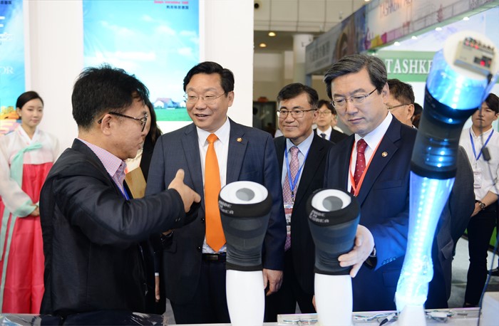 (서울=포커스뉴스) 주형환 산업통상자원부 장관이13일 중국 시안 취장국제전시센터 A홀에서 시안 실크로드박람회 주빈국 참여로 농식품, 생활용품, 의류, 화장품, 의약품 등 5대 소비재 품목의 소비재기업관, SM 융합상품관, 한국식품관(aT), K-HIT관, VR체험관(삼성전자), FTA홍보관 등 기업부스 50개사, 단체부스 50개사가 참여한 가운데 열린 ‘실크로드박람회’「국가홍보관(한국관)」개막식에 참석하여, 한국제품 전시장을 둘러보고 있다. <사진제공=산업통상자원부>