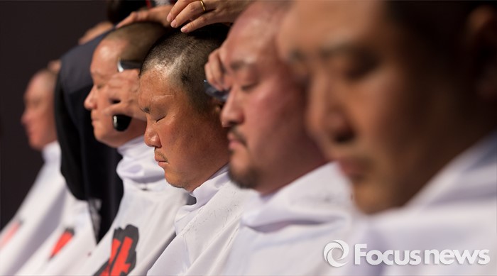 (서울=포커스뉴스) 14일 오후 서울 강서구 KBS스포츠월드에서 성과연봉제 저지를 위한 금융공기업지부 합동 대의원대회에 참석한 김문호 금융노조 위원장과 금융공기업 지부 위원장들이 총파업을 결의하며 삭발식을 하고 있다.