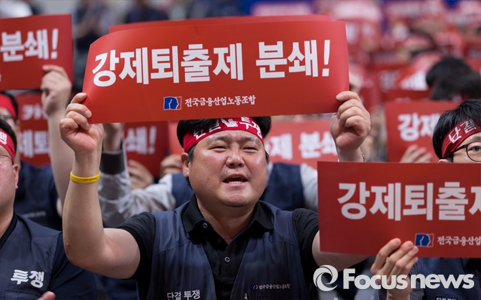 (서울=포커스뉴스) 14일 오후 서울 강서구 KBS스포츠월드에서 성과연봉제 저지를 위한 금융공기업지부 합동 대의원대회에 참석한 금융노조 조합원들이 구호를 외치고 있다.