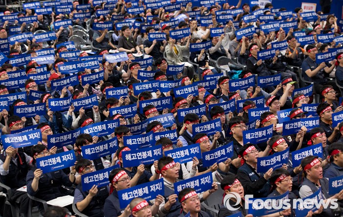(서울=포커스뉴스) 14일 오후 서울 강서구 KBS스포츠월드에서 성과연봉제 저지를 위한 금융공기업지부 합동 대의원대회에 참석한 금융노조 조합원들이 구호를 외치고 있다.