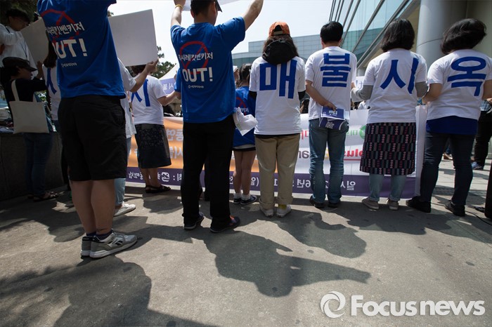 (서울=포커스뉴스) 15일 오전 서울 용산구의 한 대형마트 앞에서 환경운동연합원들이 옥시 불매를 촉구하며 기자회견을 하고 있다.