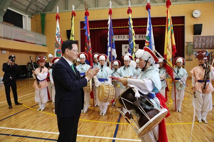 △ 건국학교 전통예술부 단원 격려하는 정의화 의장