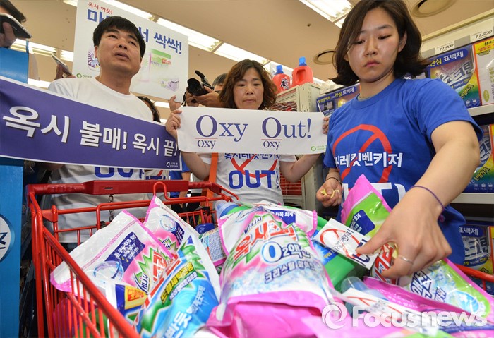 (서울=포커스뉴스) 15일 오전 서울 용산구의 한 대형마트에서 환경운동연합 회원들이 옥시제품 판매 즉각 철수를 촉구하며 불매운동 퍼포먼스를 하고 있다.