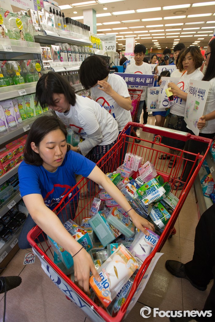 (서울=포커스뉴스) 15일 오전 서울 용산구의 한 대형마트에서 환경운동연합 회원들이 옥시제품 판매 즉각 철수를 촉구하며 불매운동 퍼포먼스를 하고 있다.