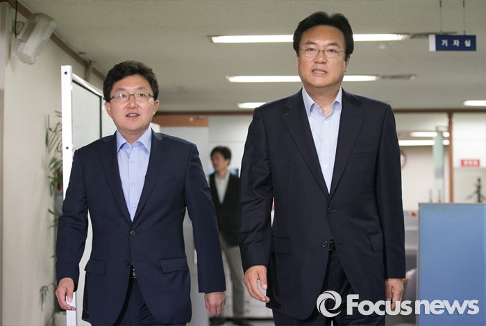 (서울=포커스뉴스) 정진석(오른쪽) 새누리당 원내대표가 15일 오후 서울 여의도 당사에서 혁신위원장으로 임명된 김용태 의원과 함께 기자회견을 위해 입장하고 있다.