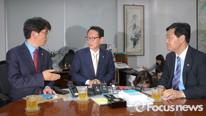 (서울=포커스뉴스) 김도읍(가운데) 새누리당 원내수석부대표, 박완주(왼쪽) 더불어민주당 원내수석부대표, 김관영 국민의당 원내수석부대표가 15일 오후 서울 여의도 국회 의원회관에서 19대 국회 마지막 본회의 안건 및 20대 국회 원구성 협상 등을 논의하고 있다.