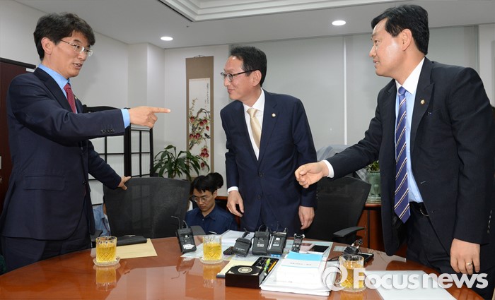 (서울=포커스뉴스) 김도읍(가운데) 새누리당 원내수석부대표, 박완주(왼쪽) 더불어민주당 원내수석부대표, 김관영 국민의당 원내수석부대표가 15일 오후 서울 여의도 국회 의원회관에서 19대 국회 마지막 본회의 안건 및 20대 국회 원구성 협상 등을 논의하기에 앞서 대화하고 있다.
