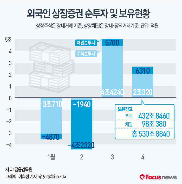 (서울=포커스뉴스) 금융감독원은 지난 4월 중 외국인 투자자가 주식과 채권을 각각 2조320억원, 6310억원 매수하면서 2조663억원이 한국 증권시장에 순유입됐다고 16일 밝혔다.