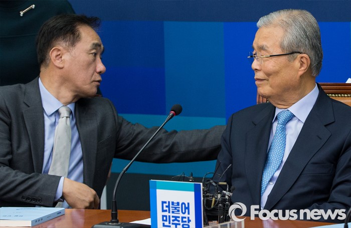 (서울=포커스뉴스) 16일 오전 서울 여의도 국회에서 열린 더불어민주당 1차 조직강화특위회의에 참석한 정장선(왼쪽) 조강특위 위원장이 김종인 대표 너머 관계자에게 문서를 전달하고 있다.