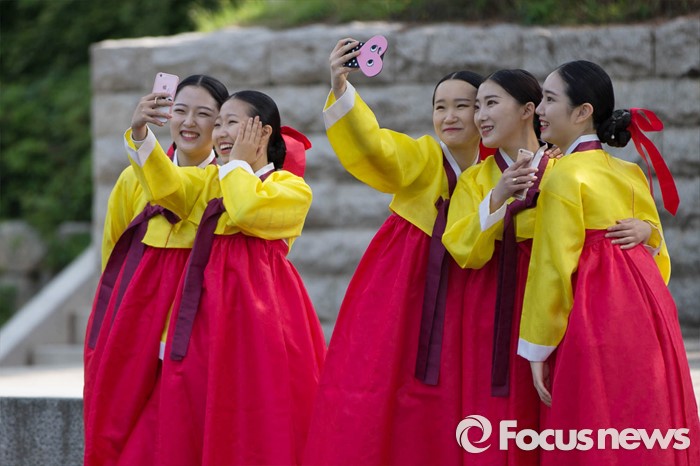 (서울=포커스뉴스) 16일 오전 서울 중구 남산골 한옥마을 천우각 광장에서 열린 제44회 성년의 날 행사에 참석한 학생들이 행사에 앞서 사진을 찍고 있다.