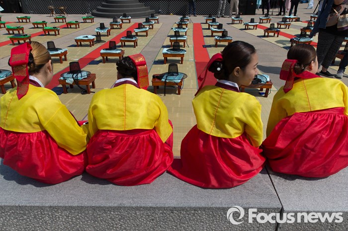 (서울=포커스뉴스) 16일 오전 서울 중구 남산골 한옥마을 천우각 광장에서 열린 제44회 성년의 날 행사에 참석한 학생들이 행사 시작을 기다리고 있다.