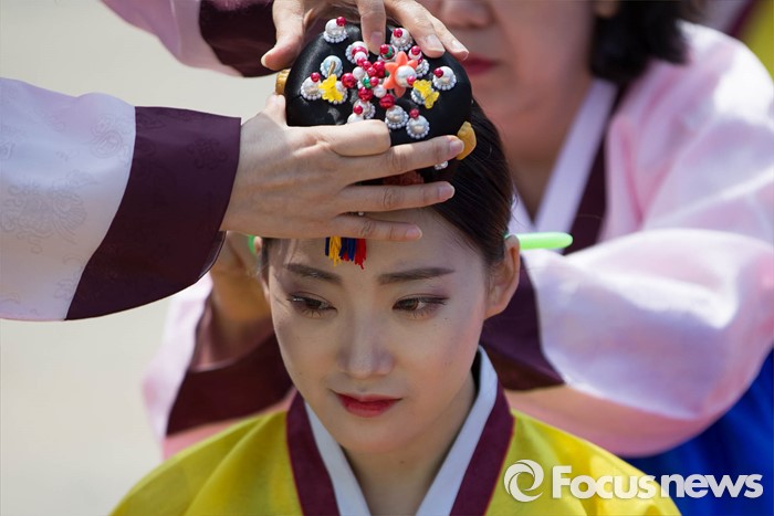 (서울=포커스뉴스) 16일 오전 서울 중구 남산골 한옥마을 천우각 광장에서 열린 제44회 성년의 날 행사에 참석한 학생들이 전통 성년례를 올리고 있다.