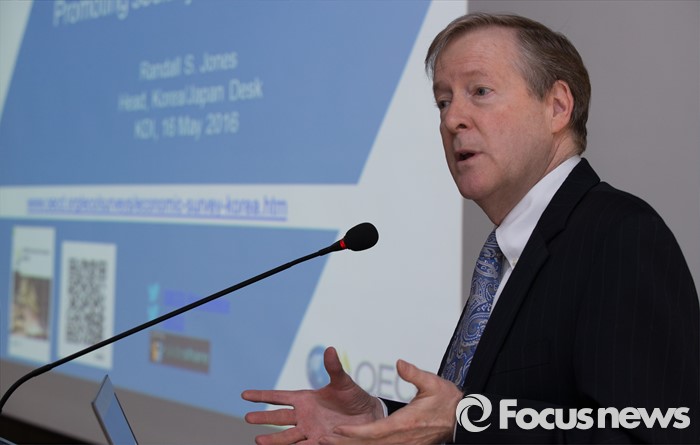 (세종=포커스뉴스) 랜달존스(Randal Jones) OECD 사무국 선임이코노미스트가 16일 오전 세종시 KDI(한국개발연구원) 영상회의실에서 열린 OECD 한국 경제보고서 발표 세미나에서 거시경제 동향 및 전망에 대한 기조발표를 하고 있다.