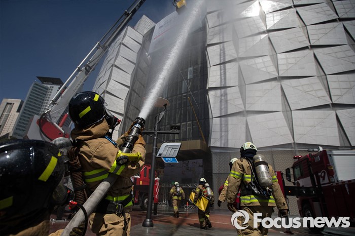 (서울=포커스뉴스) 16일 오후 서울 송파구 제2롯데월드몰에서 소방관들이 '재난대응 안전한국훈련'에 참가해 화재 진압 훈련을 하고 있다.