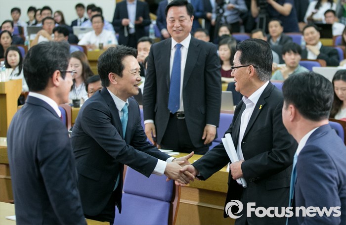 (서울=포커스뉴스) 16일 오후 서울 여의도 국회 의원회관에서 열린 '20대 국회, 협치 가능한가' 토론회에 참석한 남경필(왼쪽 두번째) 경기도지사와 박지원(오른쪽 두번째) 국민의당 원내대표가 인사하고 있다.
