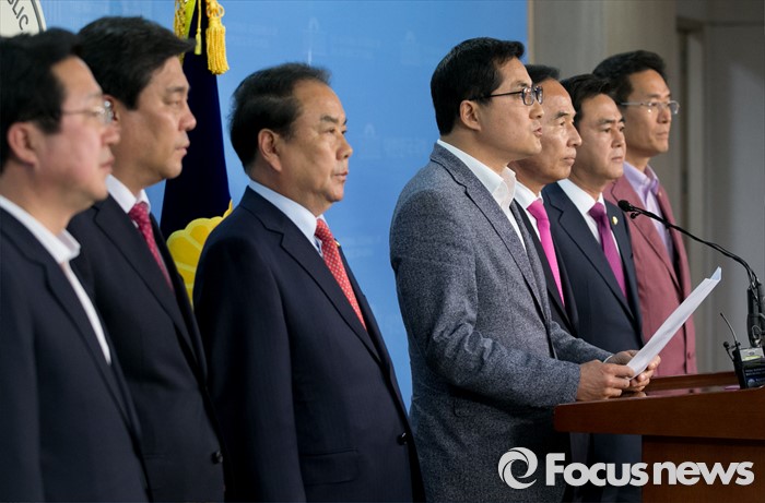(서울=포커스뉴스) 16일 오후 서울 여의도 국회 정론관에서 새누리당 초·재선 의원 및 당선인들이 당 혁신위와 비대위원 재검토를 요구하는 성명서 발표 기자회견을 하고 있다. 왼쪽부터 이장우 의원, 김선동 당선인, 이우현, 박대출, 박덕흠, 김태흠, 함진규 의원.