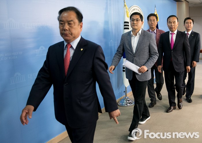 (서울=포커스뉴스) 16일 오후 서울 여의도 국회 정론관에서 새누리당 초·재선 의원 및 당선인들이 당 혁신위와 비대위원 재검토를 요구하는 성명서 발표 기자회견을 마친 뒤 퇴장하고 있다. 왼쪽부터 이우현, 박대출, 함진규, 박덕흠, 김태흠 의원.