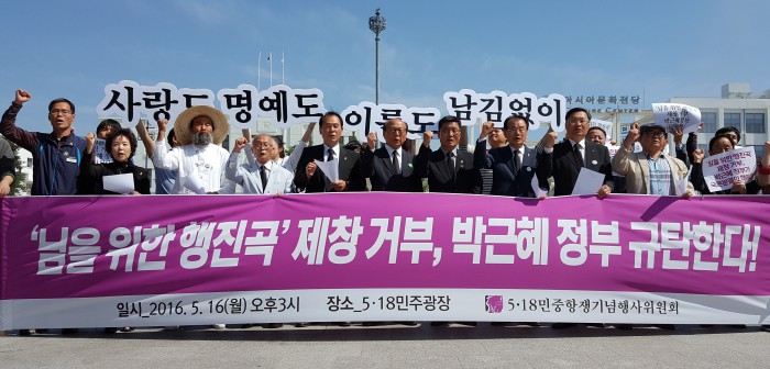기념위원회는 이날 오후 3시 광주 동구 금남로 5·18민주광장에서 기자회견을 열고 "이번 보훈처의 제창 거부 결정에 분노조차 할 수 없을 정도로 허탈하다"며 "박근혜 정권 아래서 5·18에 대한 폄하와 왜곡은 지속 될 것이라는 점을 재확인 됐다"고 목소리를 높였다.