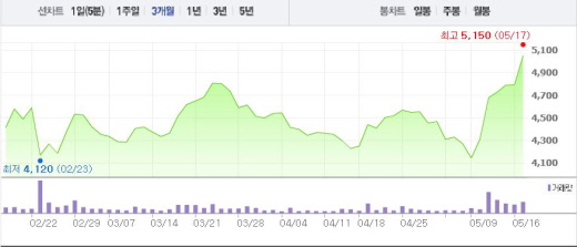 김현용 이베스트투자증권은 연구원은 “1분기 영화 부문이 14.7%의 이익률을 기록했고 방송도 호실적을 내는 어닝 서프라이즈를 기록했다”며 투자의견 ‘매수’와 목표주가 6000원을 유지했다.주가흐름<사진출처=네이버 캡쳐>