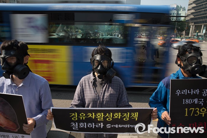 (서울=포커스뉴스) 17일 오전 서울 종로구 광화문광장 인근에서 서울환경연합원들이 경유차 활성화 정책 철회를 촉구하며 퍼포먼스를 벌이고 있다.