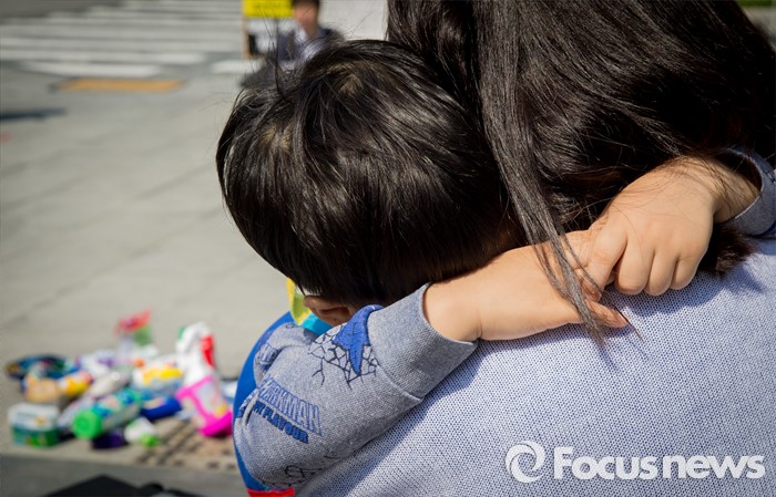 (서울=포커스뉴스) 17일 오전 서울 광화문광에서 열린 '옥시 불매, 사업장 옥시 OUT' 선언 기자회견장 앞을 엄마 품에 안긴 아이가 지나가고 있다.