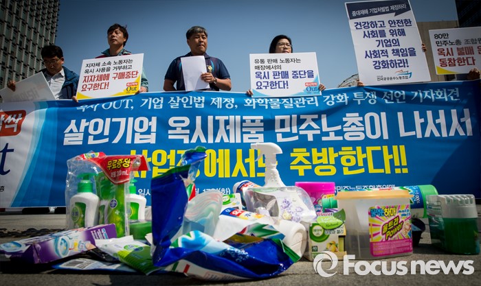 (서울=포커스뉴스) 17일 오전 서울 광화문광장에서 열린 '옥시 불매, 사업장 옥시 OUT' 선언 기자회견장에 옥시 제품들이 내팽개쳐저 있다.
