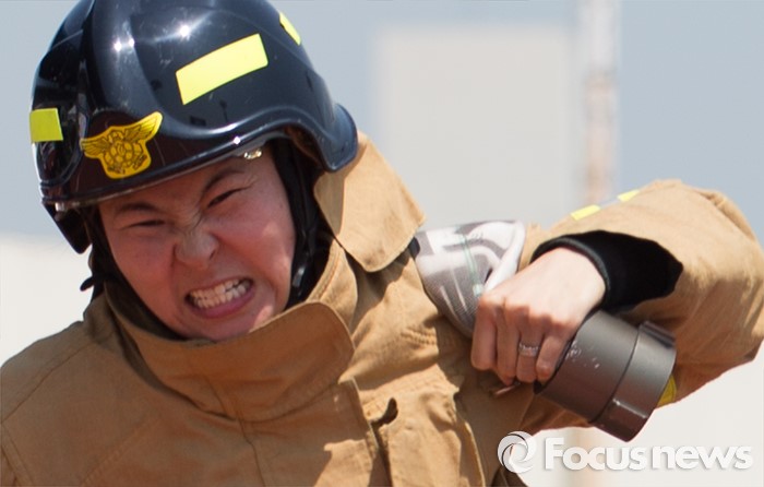 (서울=포커스뉴스) 17일 오전 서울 양천구 목동운동장에서 열린 2016 의용소방대 종합소방기술경연대회에서 참가자들이 소방호스 끌기 경기를 하고 있다.