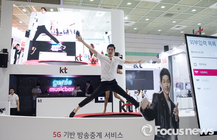 (서울=포커스뉴스) 17일 오전 서울 강남구 코엑스에서 열린 '월드 IT쇼 2016'의KT부스의 한 모델이 5G통신 기반으로한 실시간 방송을 시연하고 있다.