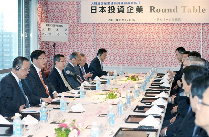 (서울=포커스뉴스) 주형환 산업통상자원부 장관이 17일 일본 동경 오쿠라호텔 메이페어룸에서 도레이BSF, 스미토모화학, 쿠라레, 테이진, 데산트 등 對韓투자 의향 보유기업 16개사 관계자와 김용국 Invest KOREA 대표 등 산업부 담당자가 참석한 가운데 투자 라운드 테이블 행사를 갖고 투자유치 프로젝트 발굴 다각화에 관해 의견을 나누고 있다. <사진제공=산업통상자원부>
